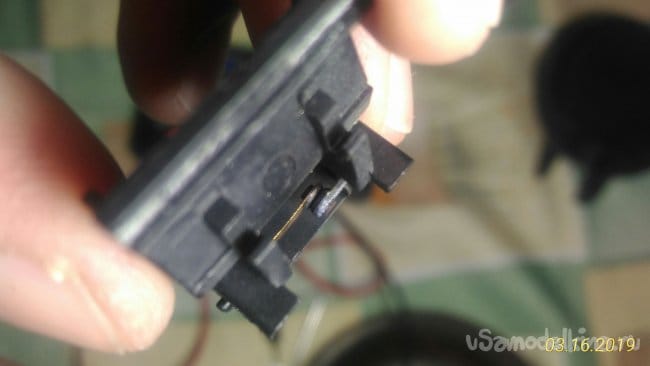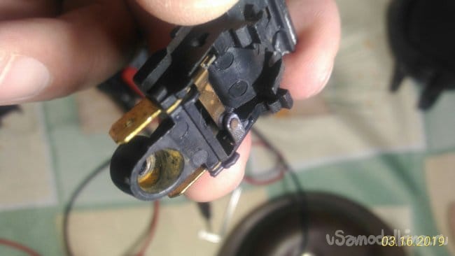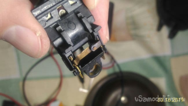 Вот мы и добрались до внутренностей ручки. Визуально все провода в норме, повреждений нет. Теперь нам надо проверить выключатель, но пока он на своем месте сделать это не совсем удобно. Снимаем выключатель. Выключатель крепится к ручке одним саморезом.