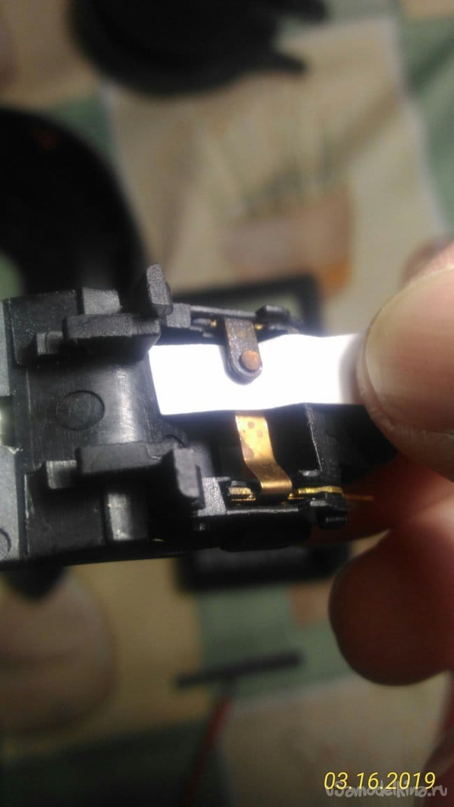 Разбираем выключатель. Верхнюю его часть, применив необходимое усилие, сдвигаем в сторону контактов и приподнимаем в верх. Что мы видим, мы видим нагар на контактах выключателя.