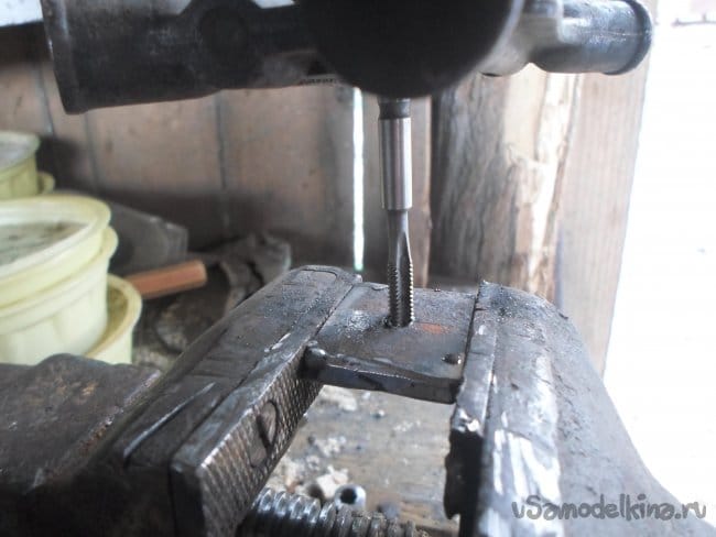 Далее сверлим отверстие дрелью и нарезаем резьбу м6