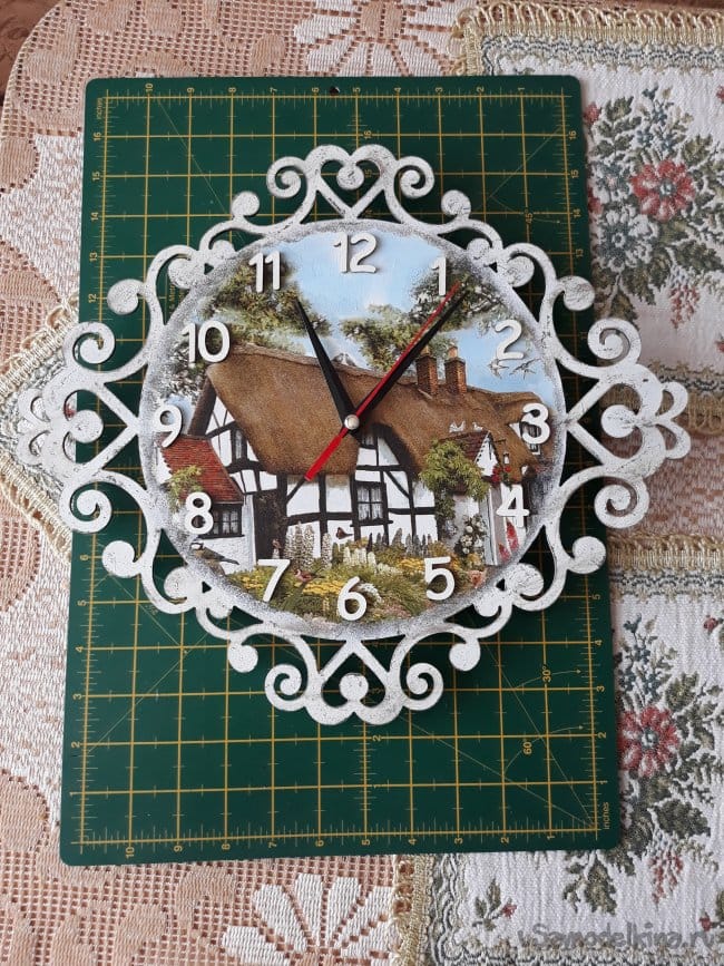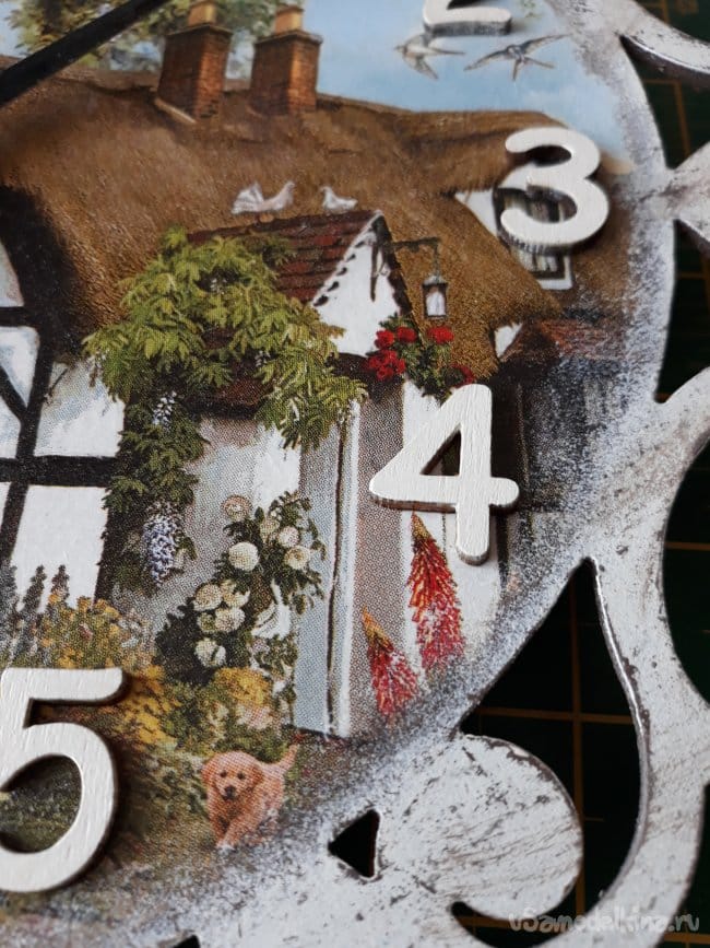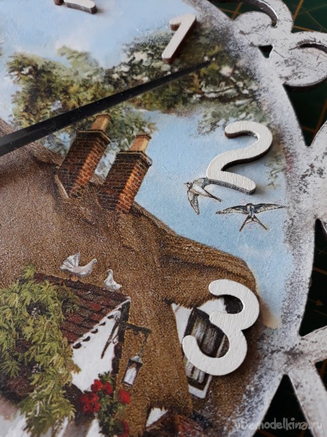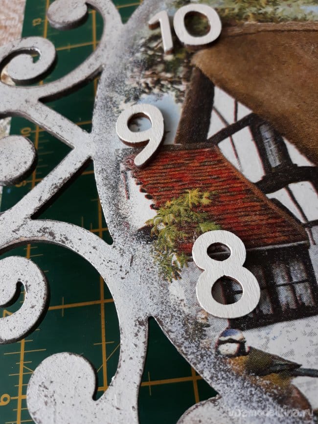 По краю приклеенного рисунка (салфетки) есть места не стыковки окраски циферблата и рисунка. Их надо аккуратно подкрасить соответствующими цветами кисточками или применяя тампоны, что бы эта грань исчезла. Размечаем и приклеиваем предварительно покрашенные цифры .