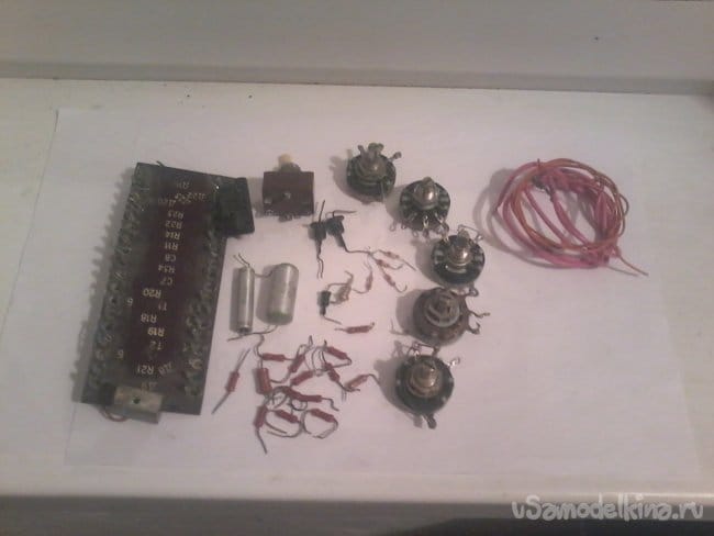 1 – тумблер ТП -1/ 2; монтажные платы, монтажные провода; Резисторы СП -1А -270 ом; 1,5 ком; 6,8 ком; 1 ком; 2,2 ком; постоянные резисторы МЛТ -1 вт 510 ом; на 0,25 вт - 1,5 ком; 5,6 ком; 470 ом; 6, 2 ком; 1,8 Ком – два; 7,5 ком; 3,6 ком; конденсатор 0,5 мкф МБМ; и 1 мкф; конденсатор электролитический 22мкф на 30 в; диоды Д2В –4 шт; зажимы типа «крокодил» - три шт; Разъем 13-ти контактный; Стабилитроны Д814Б; и Д810; диоды Д226Б –два шт.