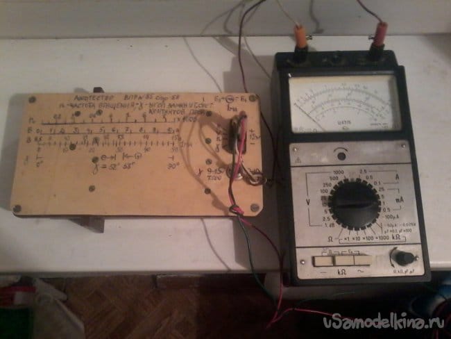 Переключатель S2 ставим в положение «9—15в», подключаем прибор Ц -4315 к выводам разъема «Б3»- плюс, «Б1» - минус прибора. Предел измерения Ц-4315 ставим на 1мА. Добиваемся установки стрелки прибора в крайнее правое положение при помощи резистора R6. После этого снижая входное напряжение через 1в, отмечаем метки на шкале. После чего тумблер S2 ставим в другое положение и проделываем те же манипуляции, что и ранее, только изменяем напряжение на входе до 10 вольт, используя при этом резистор R13. Затем для измерений угла j - тумблер S2 ставим в положение « 9—15в», замыкаем между собой клеммы «К» и «минус», при помощи резистора R8 добиваемся максимального отклонения стрелки прибора. Для проверки сопротивлений на вход тестера подаем напряжение 10в, подключаем между клеммами «К» и «минус» магазин сопротивлений и градуируем шкалу прибора. При настройке « n» тумблер S2 – в положение «1500об/мин», подаем переменное напряжение 12в на клеммы «К» и «минус». Резистором R11 устанавливаем стрелку прибора на последнее деление шкалы. Переключив тумблер S2 в другое положение резистором R9 устанавливаем стрелку прибора на деление 0,2 всей шкалы. После этого все переменные резисторы заменяем на постоянные, измерив перед этим их значения. Налаживание закончено. Затем собираю все в корпус, наношу шкалу на верхнюю крышку прибора.