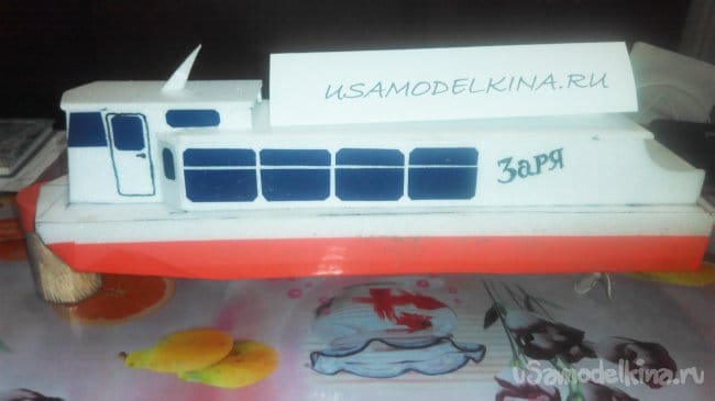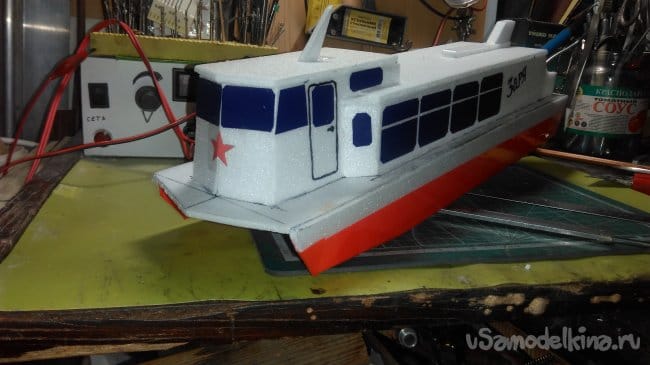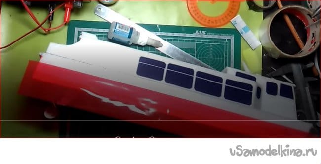 Дальше нарезаем окна ходовой рубки и наклеиваем их, начинаем обклеивать цветным скотчем красного цвета поплавки нашего корпуса, скотч проглаживаем утюгом с таким нагревом чтобы скотч натянулся, но не прожигался.
