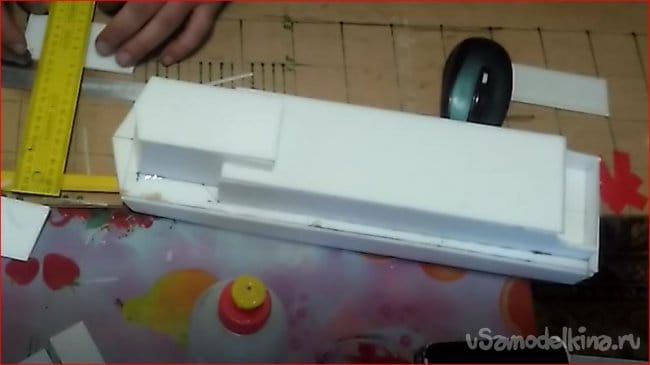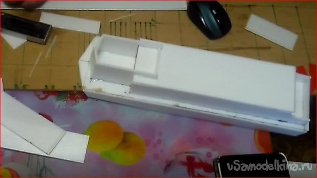 Далее нарезаем заготовки для салона и ходовой рубки и начинаем собирать конструкцию.