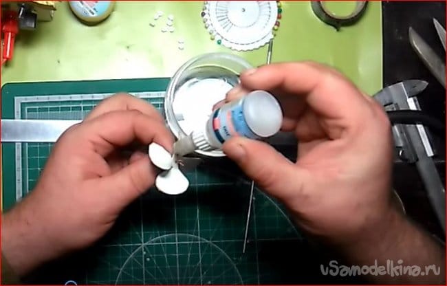 Клея на винт с проволокой и присыпаем содой, после еще одну две капли клея и присыпаем содой и повторяем эти процедуры с другой стороны винта. После высыхания придаем лопастям загиб в 35-45 градусов и наждачной бумагой обрабатываем лопасти, стачиваем заусеницы чтоб не порезаться.