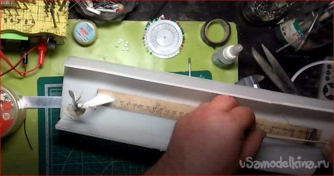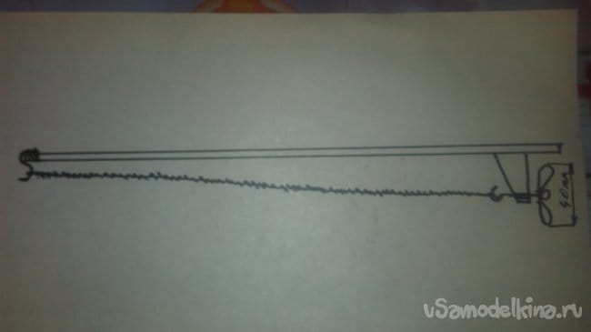 Из кусочка пластика вырезаем киль в виде треугольника, сверлим отверстие 0.7мм на 35мм от верхней стороны, это будет отверстие для вала винта. Теперь берем линейку или рейку и приклеиваем пластик верней стороной к краю рейки или линейки Клеем Cosmofen CA 12. Cosmo-500.200, прокапываем по швам и просыпаем содой с двух сторон. На другую сторону рейки или линейки нитками приматываем второй отрезок проволоки, так чтоб сделать крючок из проволоки, нитки прокапываем Клеем Cosmofen CA 12. Cosmo-500.200 смотрите схему: