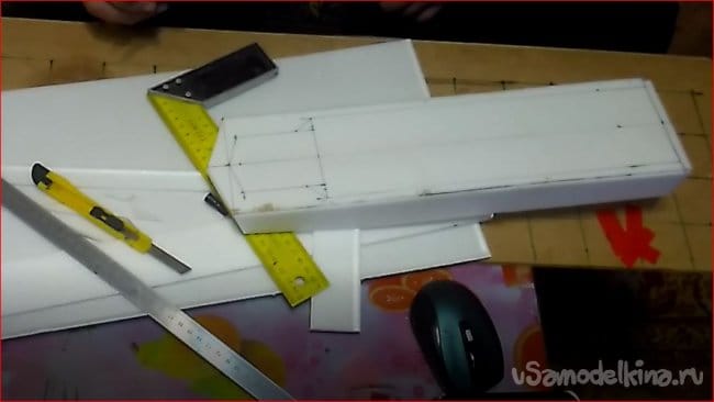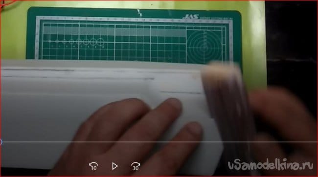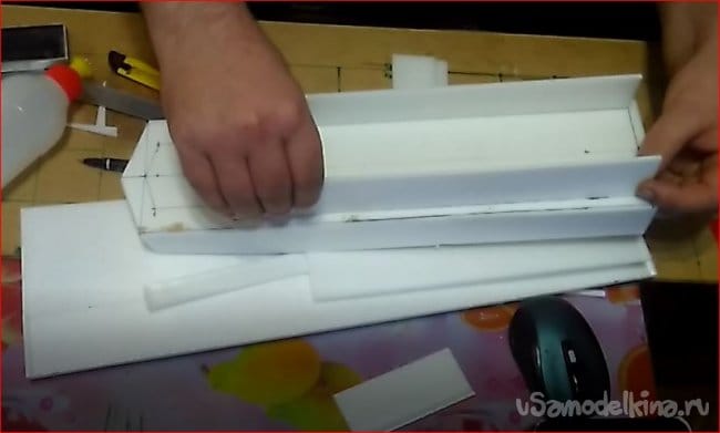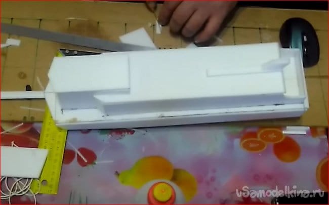 После изготовления силовой резино-моторной установки приступаем к изготовлению корпуса кораблика. Из потолочной плитки отрезаем полосу шириной 10см и длиной вашей силовой установки, это будет палубой, также отрезаем две полосы шириной 4см и приклеиваем эти полосы перпендикулярно к палубе это будут поплавки катамарана, корпуса нашей модели.