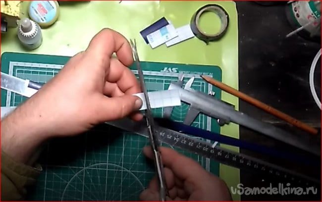 После обработки берем самоклеящуюся пленку темно синего цвета и отрезаем полоски по 2см и 1см, нарезаем их по 4см, это будут окна салона примерно так.