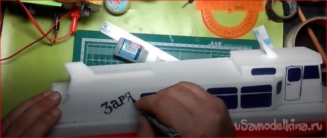 Маркером рисуем двери и название нашего теплохода- ЗАРЯ.