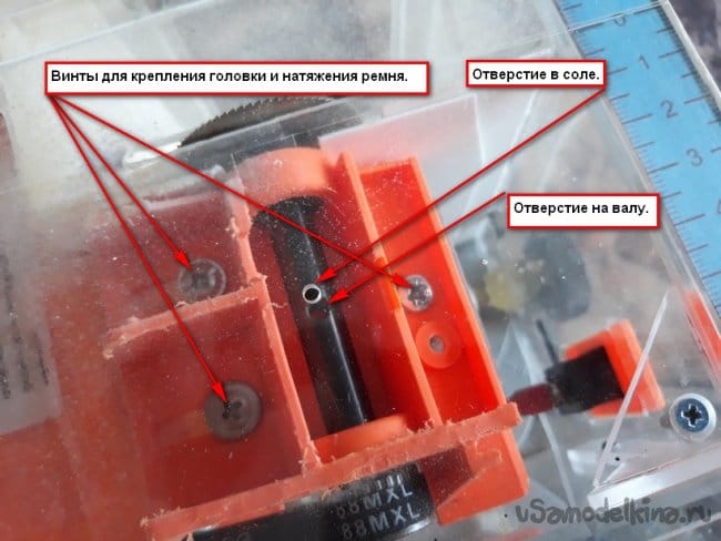 Отпилил часть коромысла с валом фрезы и подшипниками. Разметил и пропилил пазы для регулировочных винтов натяжки ремня. Чуть убрал по высоте лишний материал отпиленного кусочка коромысла, что бы стол лег как можно ближе к подшипниковому узлу.