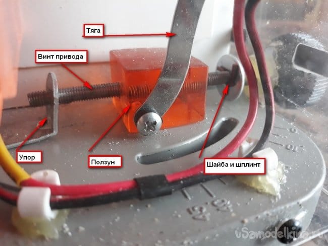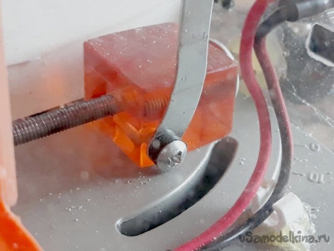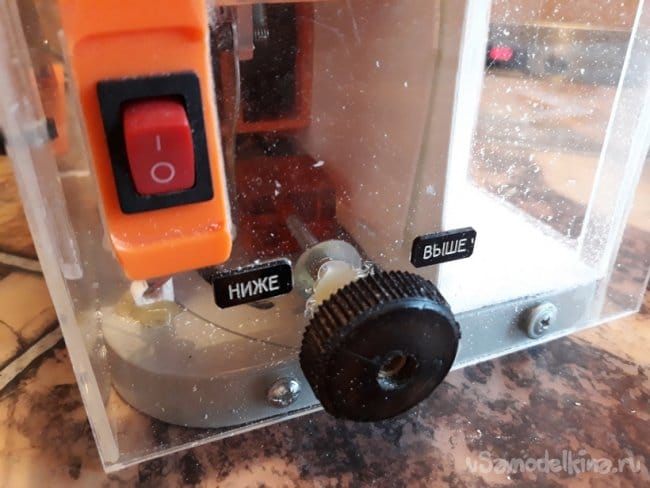 Выведя на неё штатный выключатель, а также рукоятку управления подъемом фрезы. При вращении рукоятки влево или вправо происходит подъем или опускание пильного диска. Сама рукоятка закреплена на резьбовой шпильке, которая проходит через втулку, закрепленную на передней стенке. От осевого перемещения шпилька фиксируется с одной стороны рукояткой с внутренней стороны опорной шайбой и шплинтом. На шпильке навинчен ползун (кубик с резьбой), к нему привинчена тяга, которая поднимает и опускает вал пильного диска. Конец шпильки зафиксирован упором. Все это видно на фото приведенном ниже.