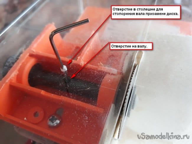 Для замены пильного диска необходимо. Совместить отверстие на валу, и отверстие на столе. Вставить ключ, тем самым зафиксировав вал.