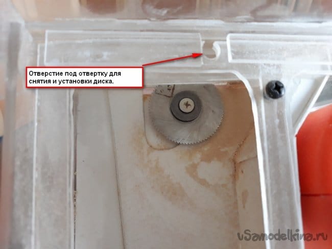 Далее через отверстие над окном выгрузки стружки вставить отвертку и открутить винт, который крепит пильный диск. Заменить пильный диск.