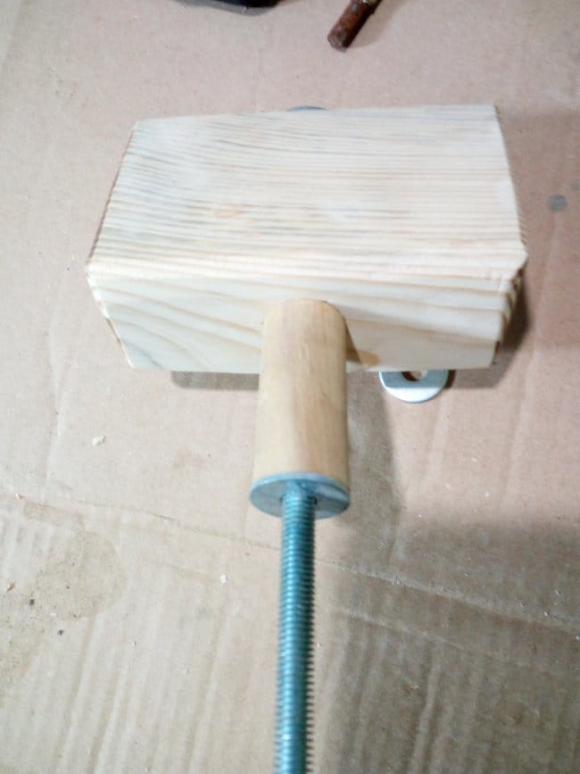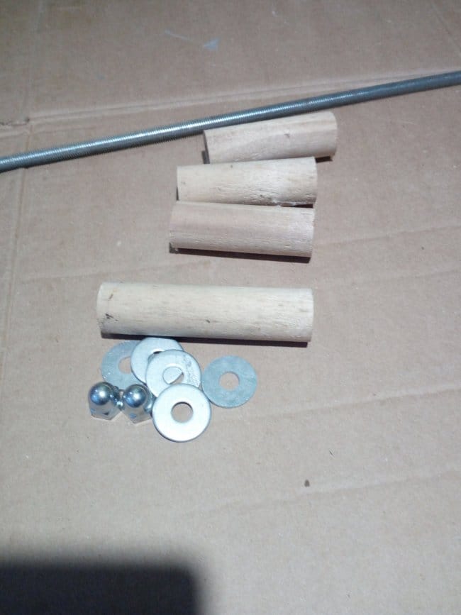 деревянный брус, шпильку М8 с резьбой, шайбы бод размер черенка, и колпачковые гайки.