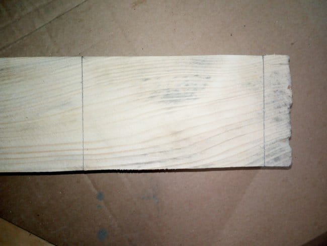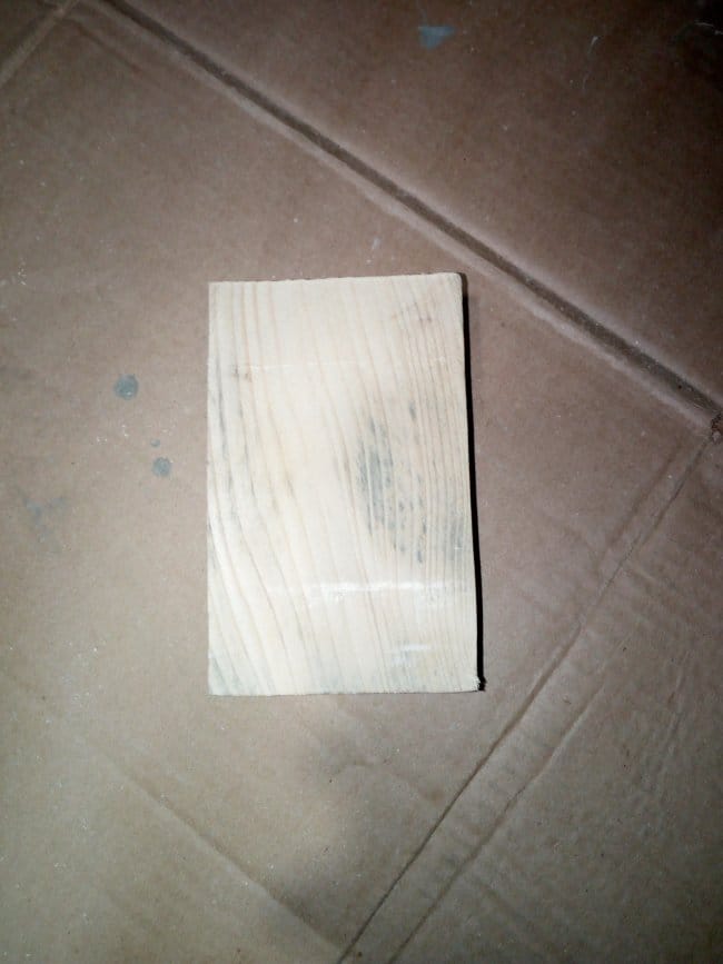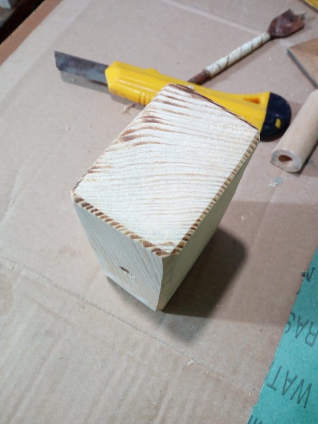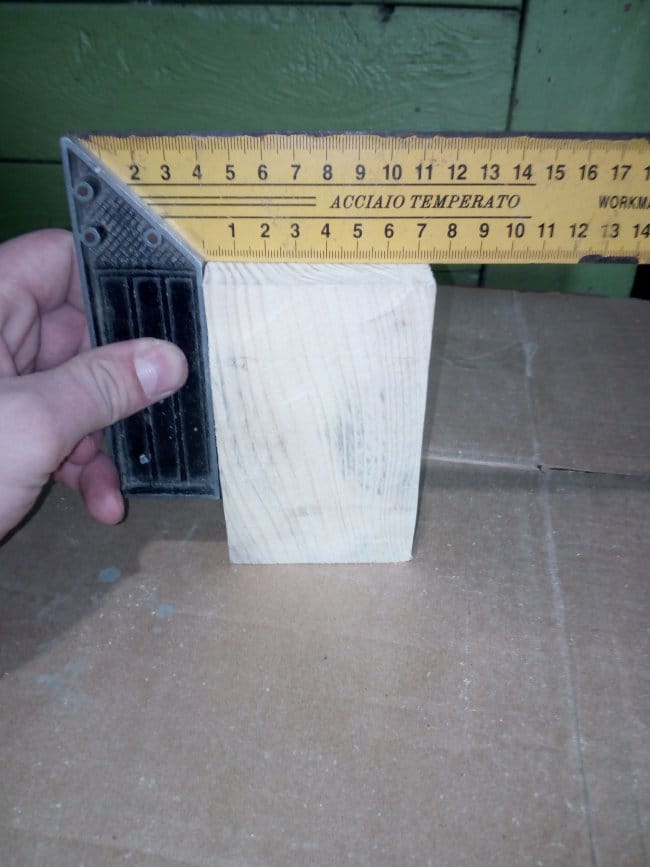 Теперь мне нужно изготовить ударную часть киянки. Для этого я использовал брусок из своих запасов, который остался от изготовления каркаса клетки для кролов. Не смог определить что это за древесина, но она достаточно тяжелая и крепкая. Пилил ее электролобзиком и все равно быстро не получилось. Было такое ощущение что пилка вязнет в древесине. Пока отпилил даже устала рука держащая лобзик. Прикинув какой размер мне будет удобен, отметил и отпилил электролобзиком. Проверил уголком - ровный ли получился срез. Немного подправил лепестковый диском.