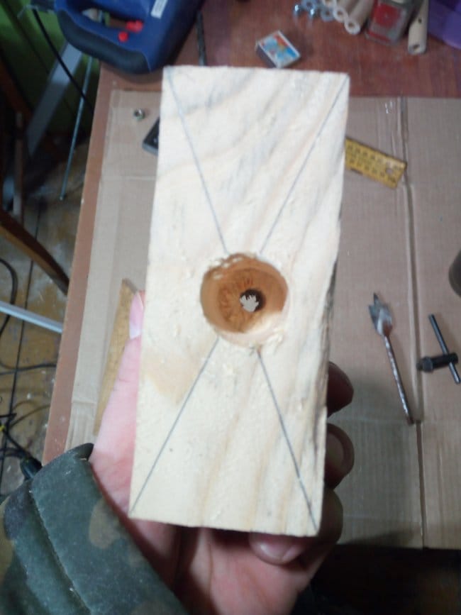 Далее перьевым сверлом на 22 я высверлил отверстие в ударной части, глубиной примерно в 1/3 от толщины заготовки. В это отверстие с небольшим трудом заходит черенок, даже не пришлось проклеивать. После этого высверливается сквозное отверстие под шпильку. Все края сглаживаю болгаркой.