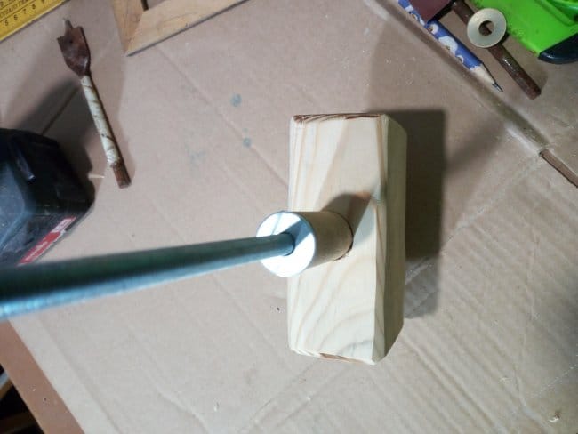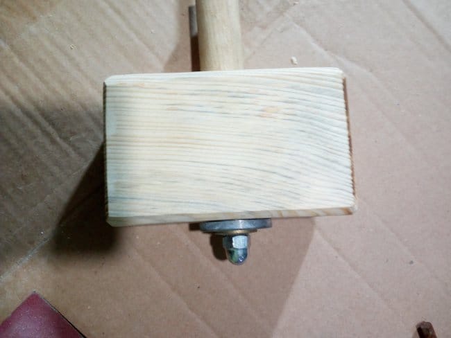 В ударную основу вставляю ту часть рукояти, которая была изначально длиннее. С помощью планки и молотка забиваю ее внутрь до упора. Отпиливаю шпильку, оставляя с каждого конца такой запас, чтобы хватило одеть на нее шайбы и закрутить гайки. Закрепляю шпильку, закрутив в верхней ударной части колпачковой гайкой, предварительно подложив под нее шайбы.