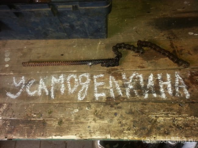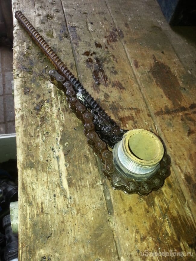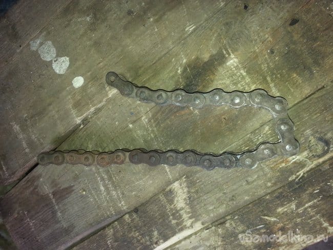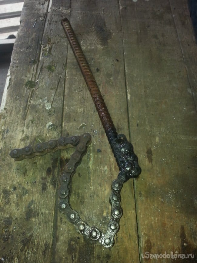 И так нам потребуется кусок арматуры 30см и кусок цепи любой можно даже велосипедной, а так же сварка и маленький болтик, который пройдет через звенья цепи.