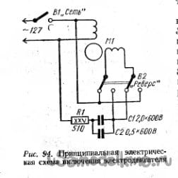 Он включал в себя: два тумблера «Сеть» и «Реверс», это понятно объяснять не надо, два конденсатора и мощный резистор в цепи фазосдвигающей обмотки.