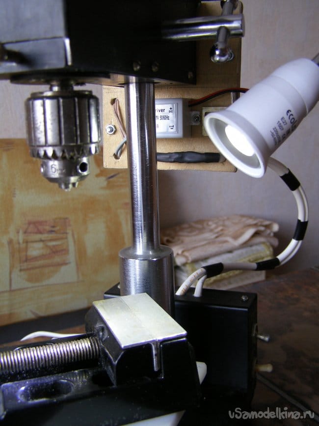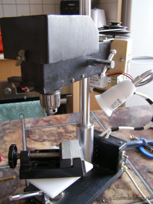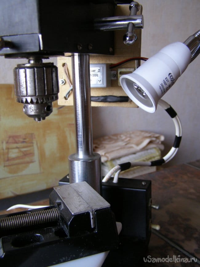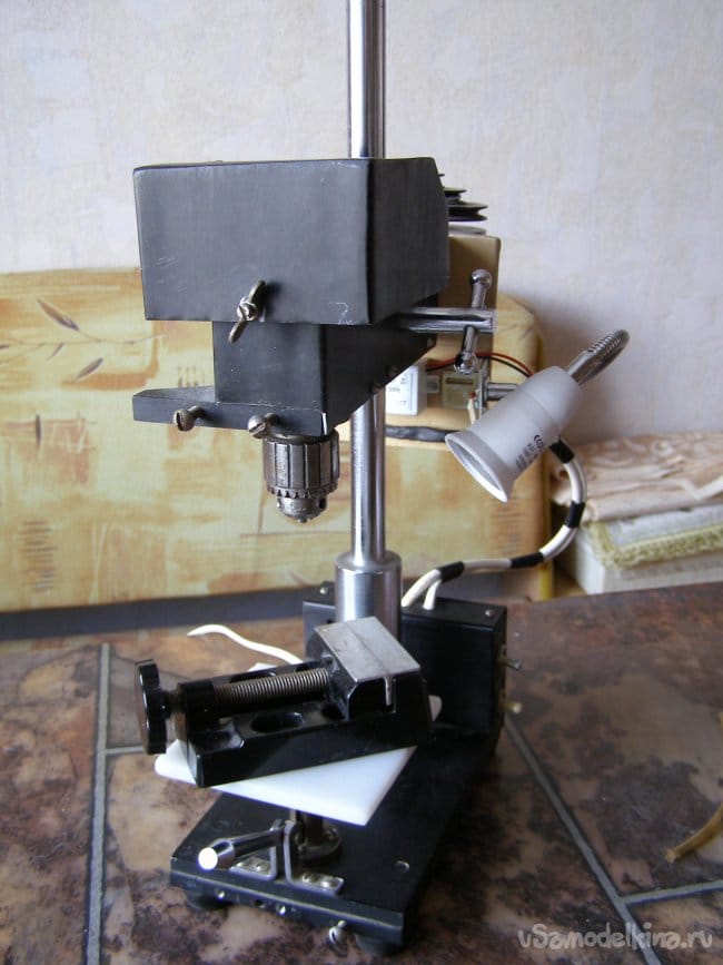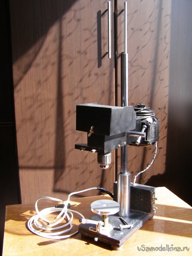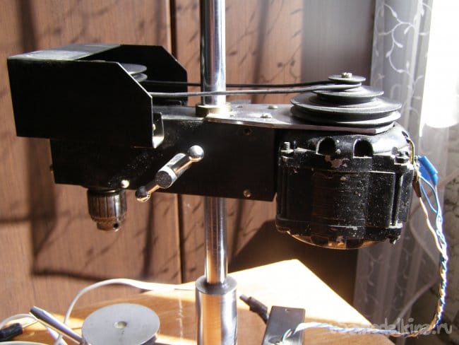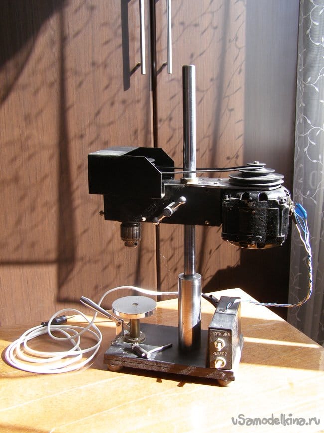 У большинства сверлильных станков опускается шпиндель с патроном к детали, а у этого поднимается стол с деталью к шпинделю. Станок работает от 220 вольт.