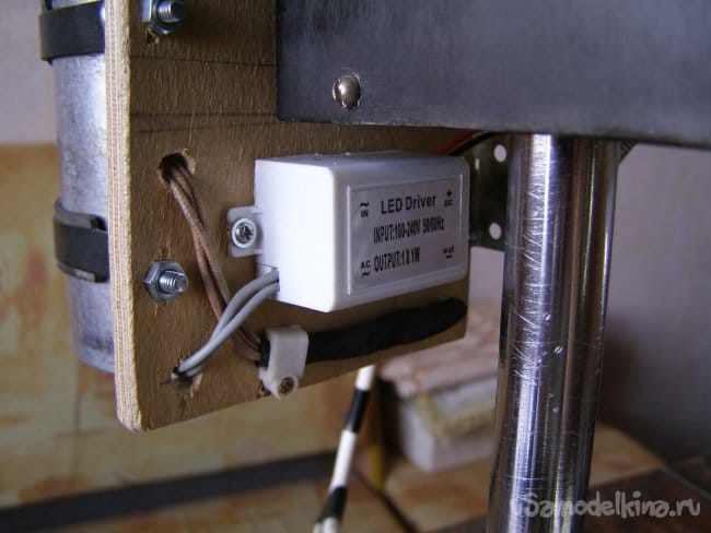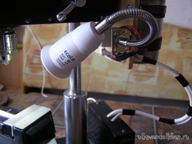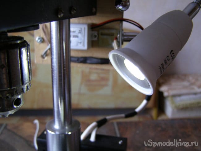 У меня до этого, были куплены и лежали в запасе точечные светодиодные светильники G770 на 220 вольт. Навскидку, я подумал, что такой светильник как раз подойдет для такого патрона как Е27, который будет хорошим корпусом ему (светильнику) . Да еще и на гнущейся ноге. Все подошло, как я и предполагал. Блок согласования по питанию от светильника разместил на кронштейне крепления электродвигателя. Лампа закреплена там же на уголке.