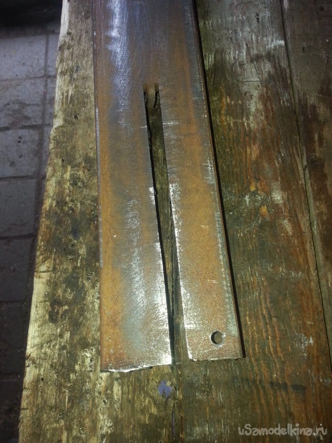 Итак, делаем пропил по середине двутавра 20см, для направления площадки, сверлим отверстие на 6мм, отступив от края 1см
