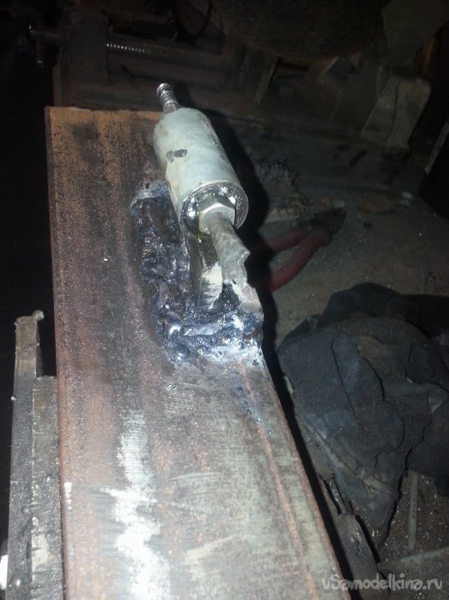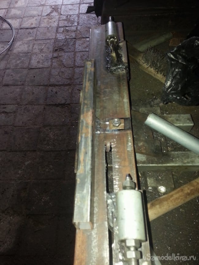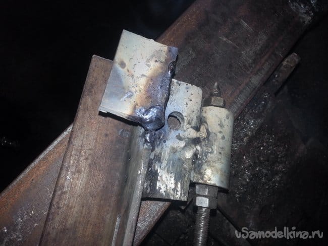 Просверливаю отверстие в двутавре на 4мм, а потом рассверливаю 6мм сверлом. Вставляю болт изнутри двутавра и привариваю, ставлю планку на место