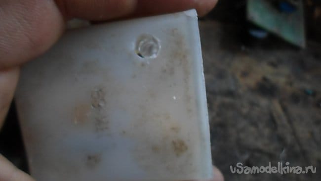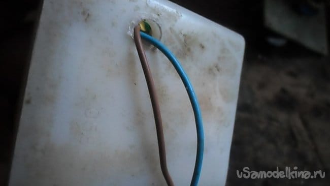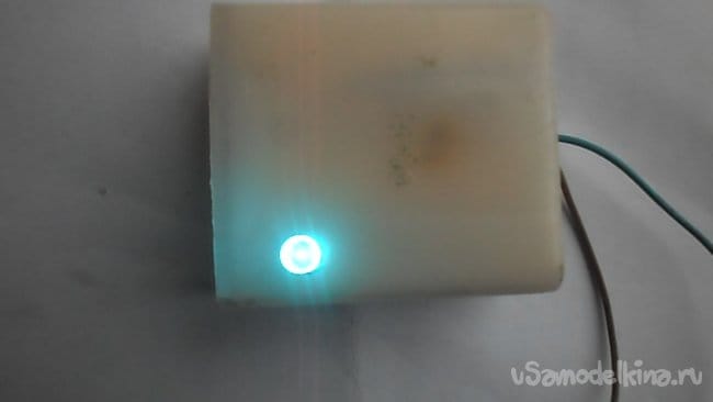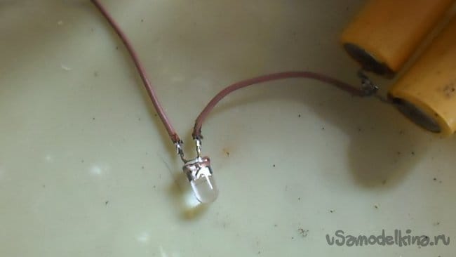 Засовываем наши аккумуляторы в корпус, в одно отверстие высовываем провода, в другое вклеиваем светодиод, боковое отверстие закрываем кусочком пластика