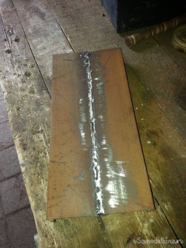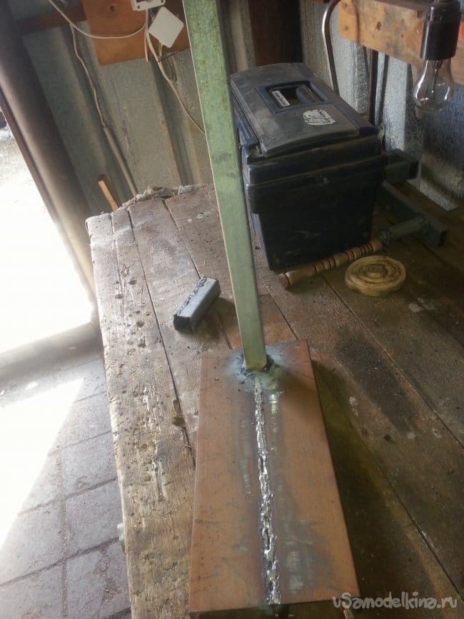 Теперь выставляю под уровень квадрат и основательно привариваю по середине площади отступив от края 2см.
