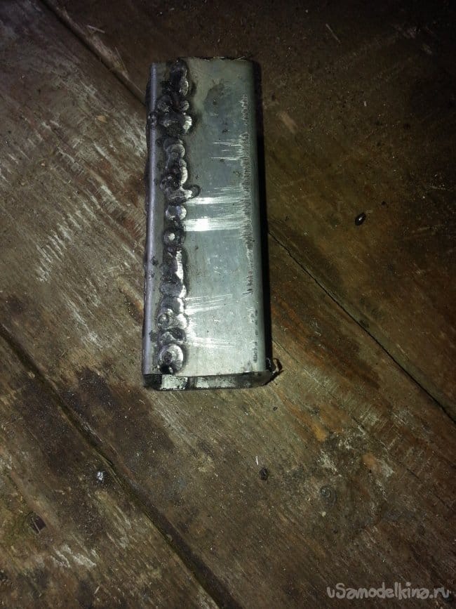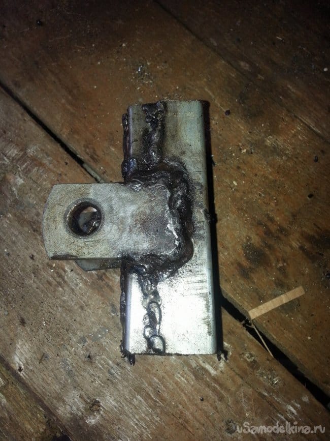 Теперь из подходящего металла делаю ушки с отверстием под болт, привариваю в отрезку квадрата. Даю остыть самому иначе если остудить быстро, может покоробить.