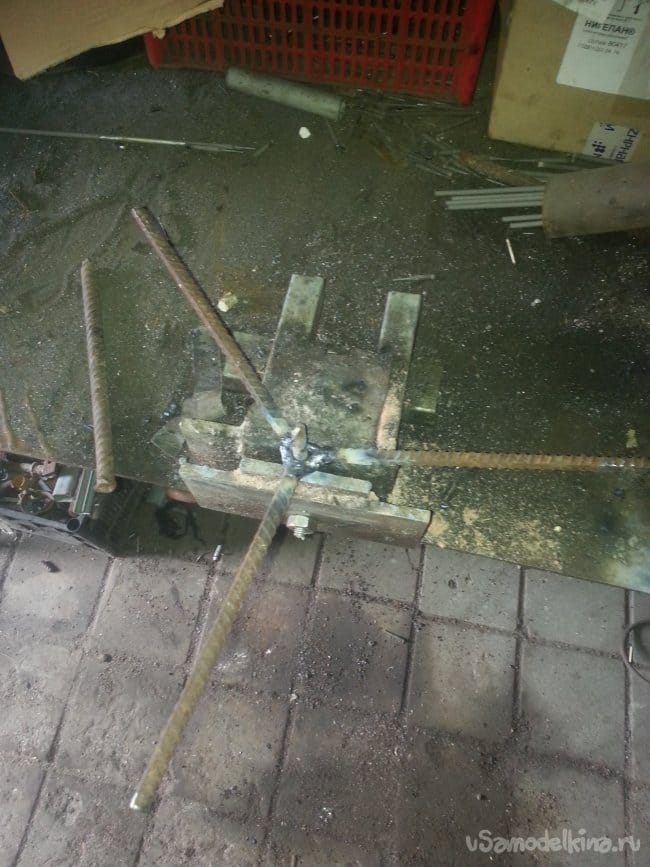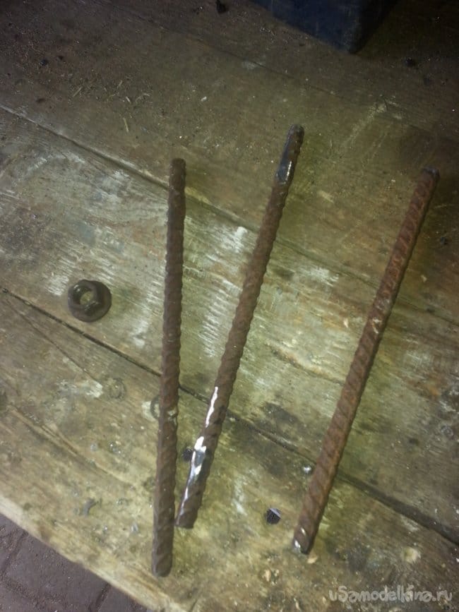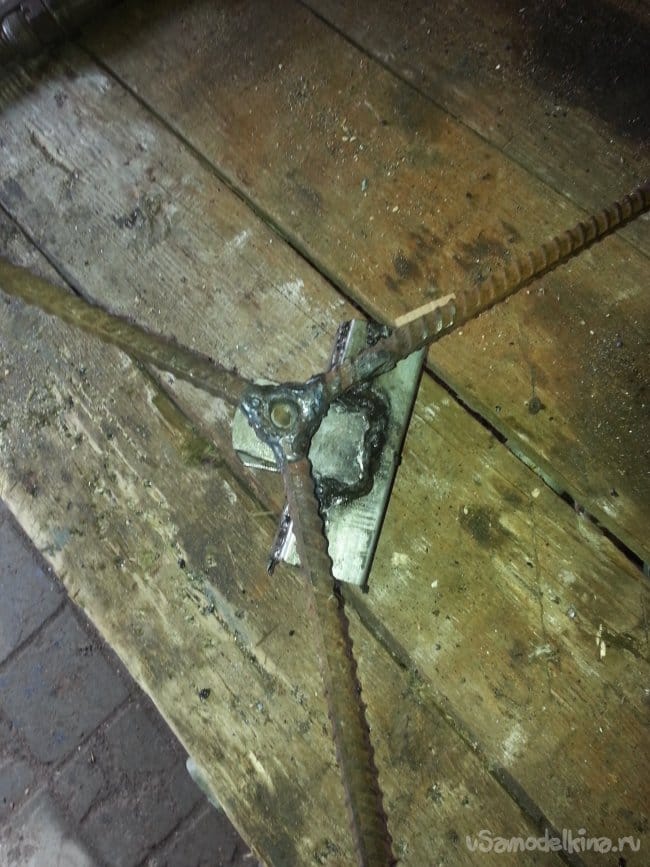 Зажимаю гайку от болта в тисках и на грани привариваю арматуру.