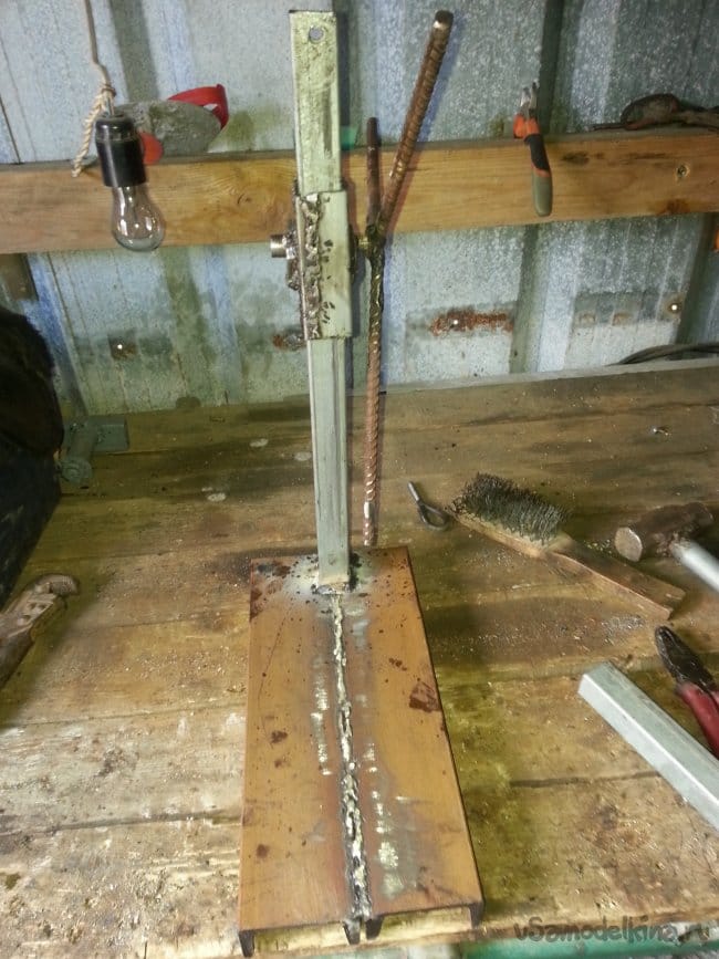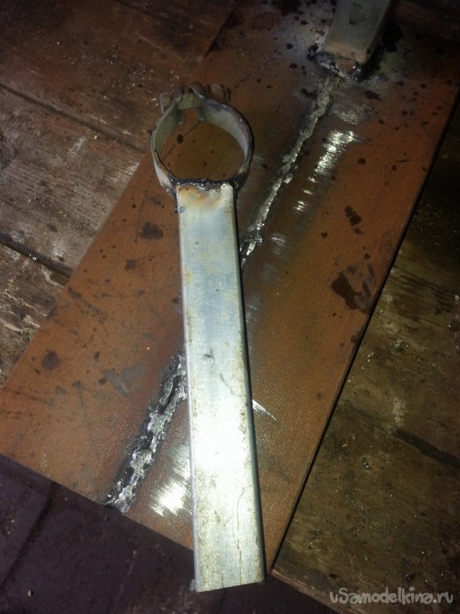 Теперь приступаю к держателю дрели, беру квадрат 30см и подходящий хомут который подойдет на корпус дрели, привариваю к квадрату хомут, теперь привариваю к стойки