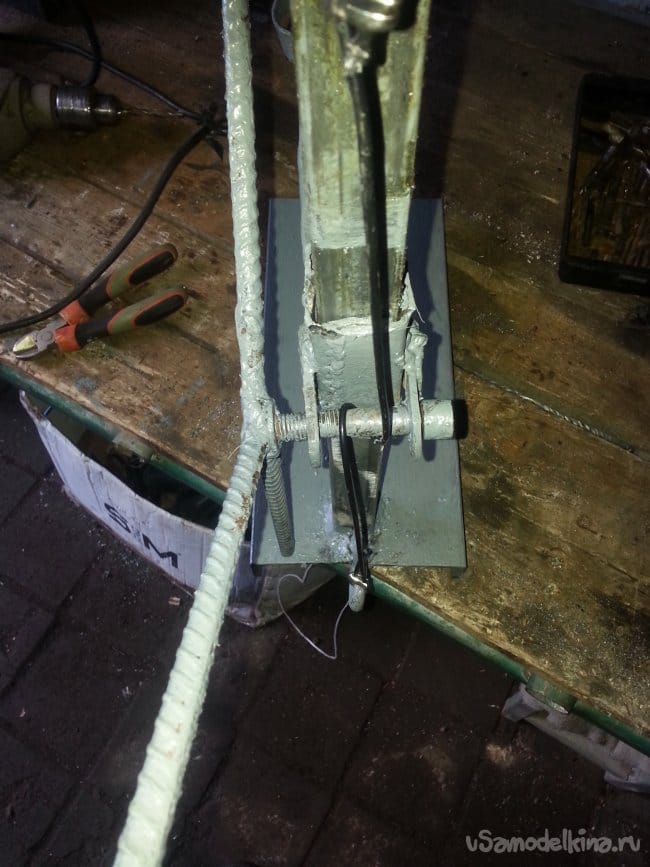 Теперь приступаю к подъемному механизму, в интернете много видел конструкций и в основном самая распространенная схема эта, как сделал я, с тросом. Самый качественный вариант это, когда на валу ставится шестерня, а в место троса двойная цепь. Ну, а я пошёл по самому легкому пути, берем два крючка и привариваем один снизу, второй напротив сверху, один конец троса садим на хомут второй накрутив оборот на вал, хорошо натянув закрепляем на верхний крючок. Все, механизм готов.