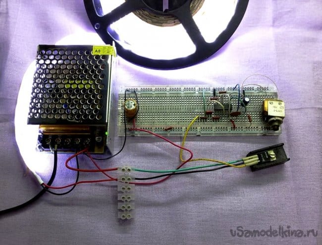 Отрезаем необходимую для установки длину светодиодной ленты, не забывая при этом о запасе по мощности до 20%. Убрав из монтажной схемы светодиод, дополняем схему таймера до приведенной выше. Подключаем силовой транзистор ѴТ2 на радиаторе, импульсный блок питания и рабочий отрезок светодиодной ленты (в приведенной конструкции рабочая длина светодиодной ленты равна 4 м).