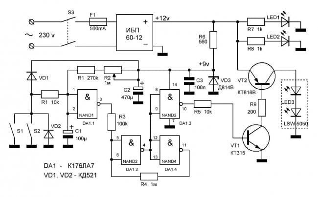 При нажатии на кнопку S1 или S2, замкнутый накоротко конденсатор С1 быстро разряжается. При этом, напряжение на С1 и входах DA1.1 падает до ноля (0), логический уровень на выходе 10 DA1.3 изменяется на (1), транзисторы ѴТ1 и ѴТ2 открываются и светодиодная лента включается.