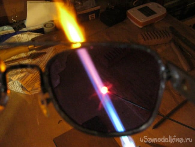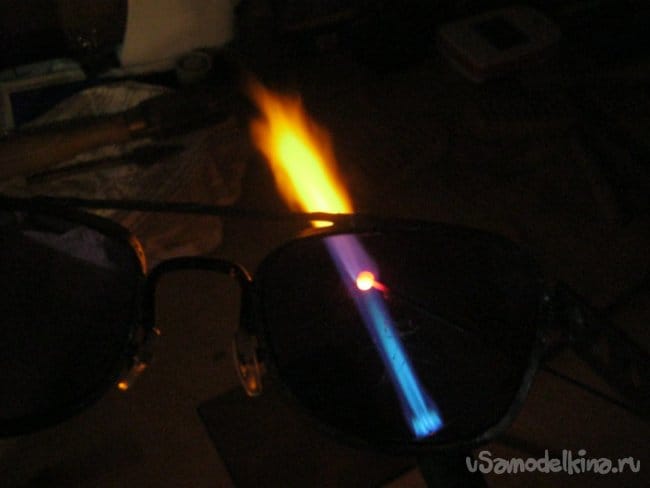 Неодимовое стекло практически полностью вырезает оранжевое свечение натрия и позволяет наблюдать за разогреваемой в пламени стекляшкой. Это очень удобно при работе.