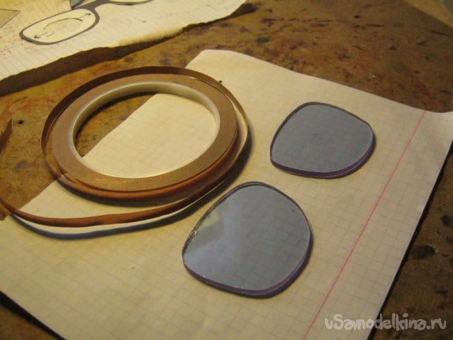 Во всемирной паутине найден силуэт оправы со стеклами подходящей формы, отмасштабирован до нужного размера, распечатан в натуральном виде, примерен.