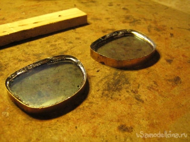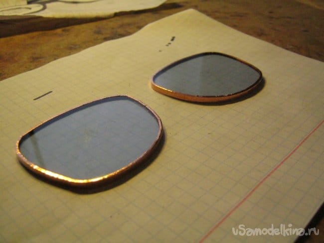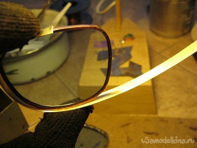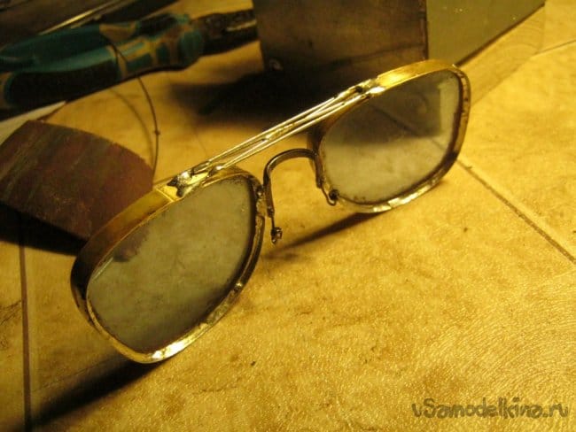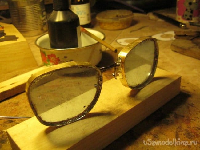 Соединение подготовленных стекол в единую «оптическую систему» сделано стандартной очковой деталью. К счастью, она оказалась латунной никелированной и после зачистки декоративного покрытия хорошо паялась. Мягкие прокладки для носа отсоединены на время работ. Прочность конструкции оказалась не высока, пришлось ее дополнить проволочными упорами и раскосами. Проволока медная от старого трансформатора, лаковая изоляция зачищена шкуркой, проволока залужена тем же припоем без свинца.