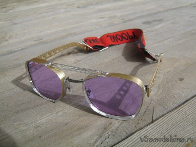 Очки отмыты растворителем от остатков флюса и собраны. Примерка показала, что без ленты очки сидят приемлемо, но резкий кивок вниз может их сбросить. Присоединение ленты разом решило проблему, кроме того вес довольно тяжелых (особенно в передней части – припой, железки, толстые стекла) очков распределяется значительно удачнее, они не мешают даже при длительном ношении.