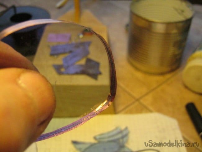 Лента вырезана слесарными ножницами по металлу, примерена, уточнена ее длина, обрезано лишнее. Заготовка зачищена мелкой шлифовальной шкуркой и плотно намотана на стеклянную заготовку. Зафиксирована снаружи тонкой медной проволокой.