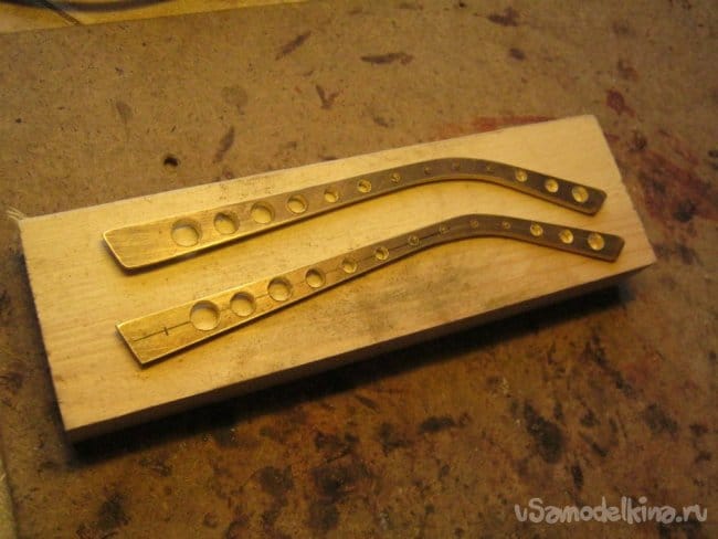 Дужки очков выпилены моим любимым инструментом – ювелирным лобзиком, из латунного листа толщиной 2 мм. Для облегчения деталей в них просверлен ряд отверстий. При этом в отверстия в примыкающей к очкам части впаяны петельки, выковырянные из пластиковой фабричной оправы, а в отверстия на концах дужек будет крепиться резинка на затылок очкарика.