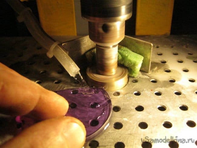 При обработке столкнулись с неприятным моментом – неодимовое стекло оказалось мягче обычного витражного, не говоря уже о листовом оконном. Открытие это стоило нам нескольких царапин на «линзах» после верчения их на стальной рабочей поверхности станка, впрочем, фабричные машинки такого рода имеют пластиковый рабочий стол.