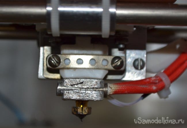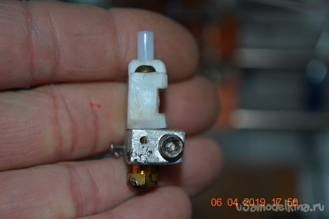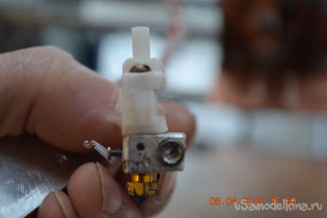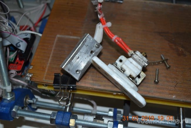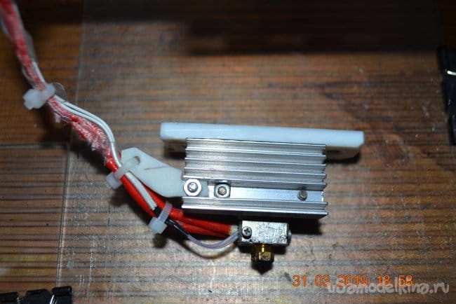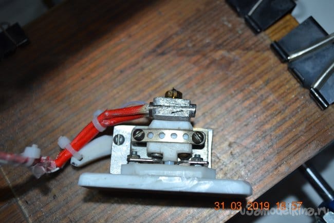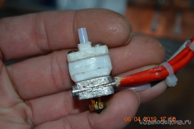Теперь соединяем нагревательный блок и фторопластовый блок,обратить внимание надо на то что бы хватило завернуть сопло в нагревательный блок.