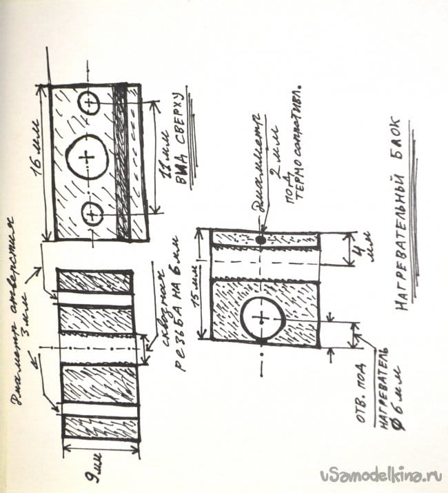 Вначале изготавливаем нагревательный блок,просверливаем отверстия по размеру указанном на рисунке.