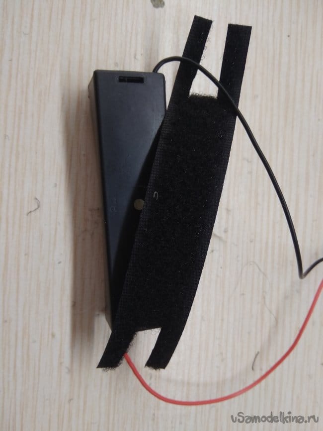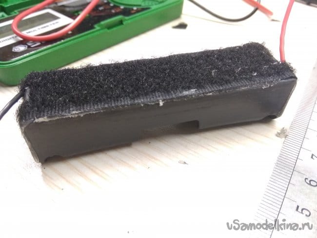 Отверстие по форме касеты вырезал канцелярским ножом, получилось не очень аккуратно, и с размером на пару миллиметров я ошибся. А планировалось что кассета плотно сядет в отверстие и вытаскиваться будет только аккумулятор. Спасло ситуацию, то что кассета купленная на Таобао, ооочень плотно фиксирует аккумулятор и выпасть он никак не сможет. Его достать-то от туда непросто. В общем наклеил на скорлупу шлема липучку, а ответную её часть на кассету, и для удобства сделал запас провода питания. Получилось даже удобней чем задумывал изначально. Теперь весь батарейный блок вытаскивается за шнурок и уже потом производится замена аккумулятора.