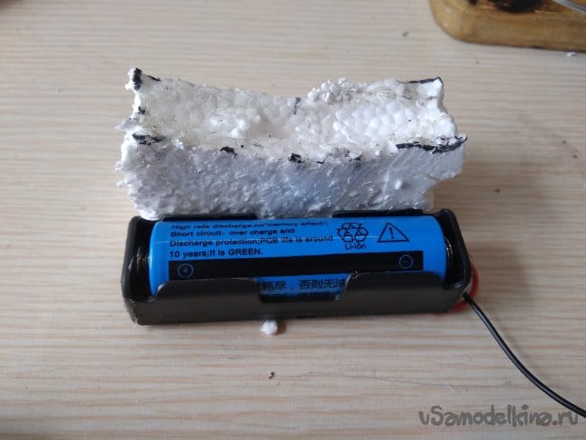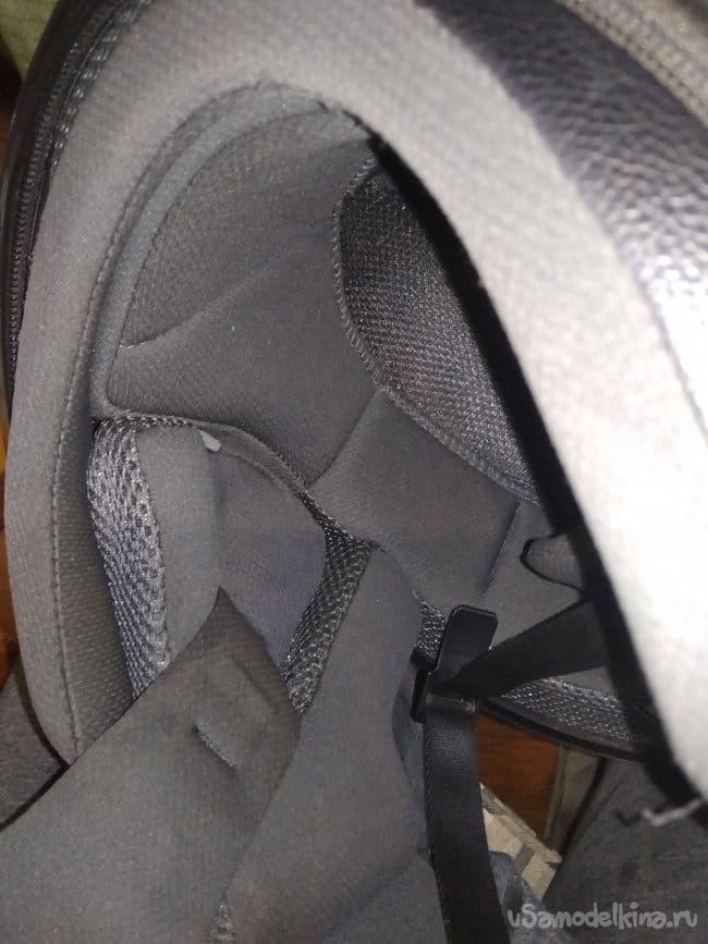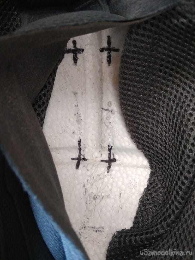 Итак, для начала я определился с местом для аккумулятора, разместив его в верхней части шлема, там где самый толстый слой пенопласта.