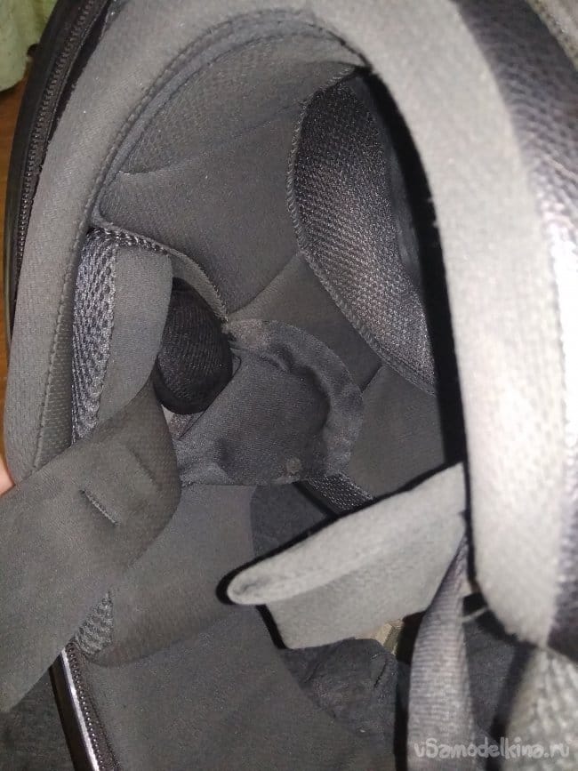 Шаг 4: Динамики установил в углублениях для ушей, места там предостаточно. Там, как и в клюве стоит обшивка, похожая на полиуретан - такие треугольники обтянутые тканью. Но из-за ремешков эти треугольники стоят под углом, из-за чего наушники вставали неправильно. Проблема решилась элементарно — просто сделал вырезы для ремешков в полиуретане и всё стало как надо.