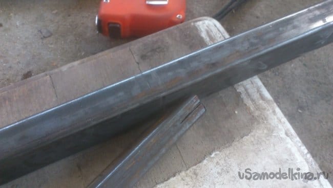 Так как я решил делать сразу две стойки, то и материалы решил нарезать сразу в двойном количестве. Прикинув нужный размер, отрезал четыре отрезка, длиной 1800 мм (Это будет высота стойки). Так как труб мало, не стал заморачиваться с отрезным станком. Отметил угольником и отпилил болгаркой: