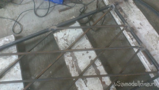 Зачищаем швы и варим вторую диагональ, и параллельные ей линии, располагая их вторым слоем. (Так как "глубина" рамки у нас 30 мм, а решётка выполняется из труб 15 на 15 мм, то второй слой как раз помещается заподлицо: