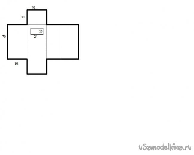 Корпус будущих часов изготовим из тонкого пластика. Можно купить лист такого пластика в специализированном магазине или заказать на aliexpress. А можно (чтобы не ждать и не искать) сходить в канцелярский и купить скоросшиватель для бумаги из пластика понравившегося цвета. Размеры будущий часов: ширина – 40 мм, толщина – 30 мм, высота – 70 мм. Согласно схеме ниже, вырезаем развертку из пластика: